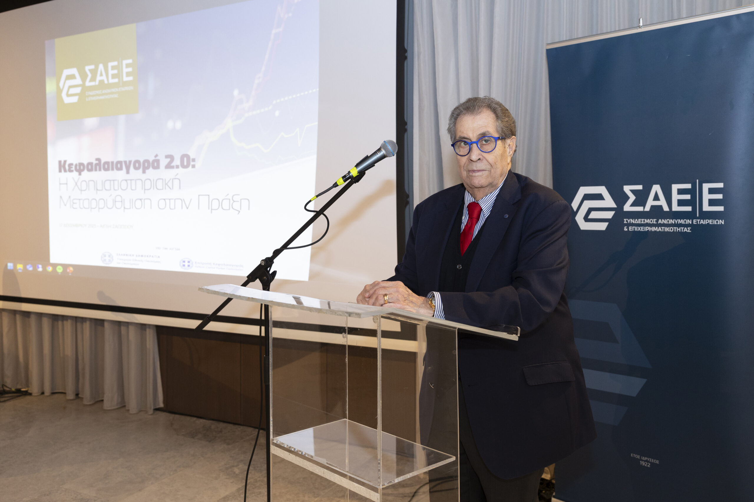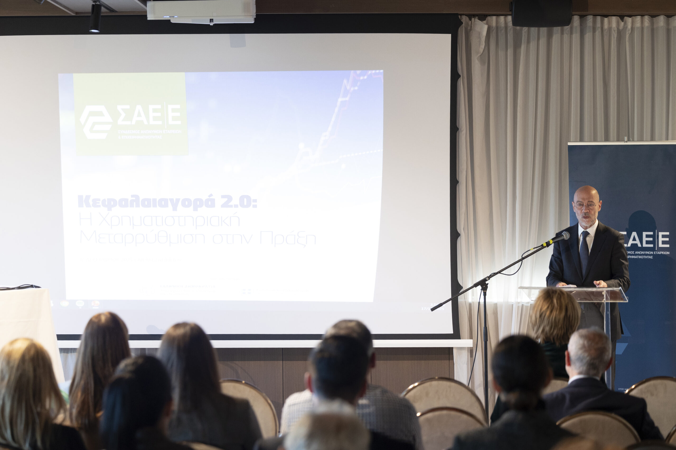 Στον εναρκτήριο χαιρετισμό του, ο Πρόεδρος του ΣΑΕΕ κ. Σίμος Αναστασόπουλος υπογράμμισε ότι η ελληνική κεφαλαιαγορά βρίσκεται σε ένα κρίσιμο σημείο μετάβασης, τονίζοντας πως η ενίσχυση της διεθνούς παρουσίας της χώρας δημιουργεί νέες δυνατότητες άντλησης κεφαλαίων και πρόσβασης σε ώριμες αγορές. Παράλληλα, επισήμανε ότι η νέα πραγματικότητα απαιτεί σαφείς στρατηγικές, αυξημένη ανταγωνιστικότητα και υψηλότερα πρότυπα διαφάνειας και εταιρικής διακυβέρνησης, προκειμένου η αγορά κεφαλαίου να λειτουργήσει ως ουσιαστικός μοχλός ανάπτυξης για την ελληνική οικονομία.