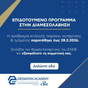 Πρόγρ. επιμόρφωσης στη διαδικασία διαμεσολάβησης της δράσης «Επιτάχυνση της απονομής της Δικαιοσύνης». Παράταση επιλογής παρόχου κατάρτισης και τμήματος. ΣΑΕ|Ε Δράσεις 16 Ιανουαρίου 2026 Μοιράσου στο Facebook Share on X